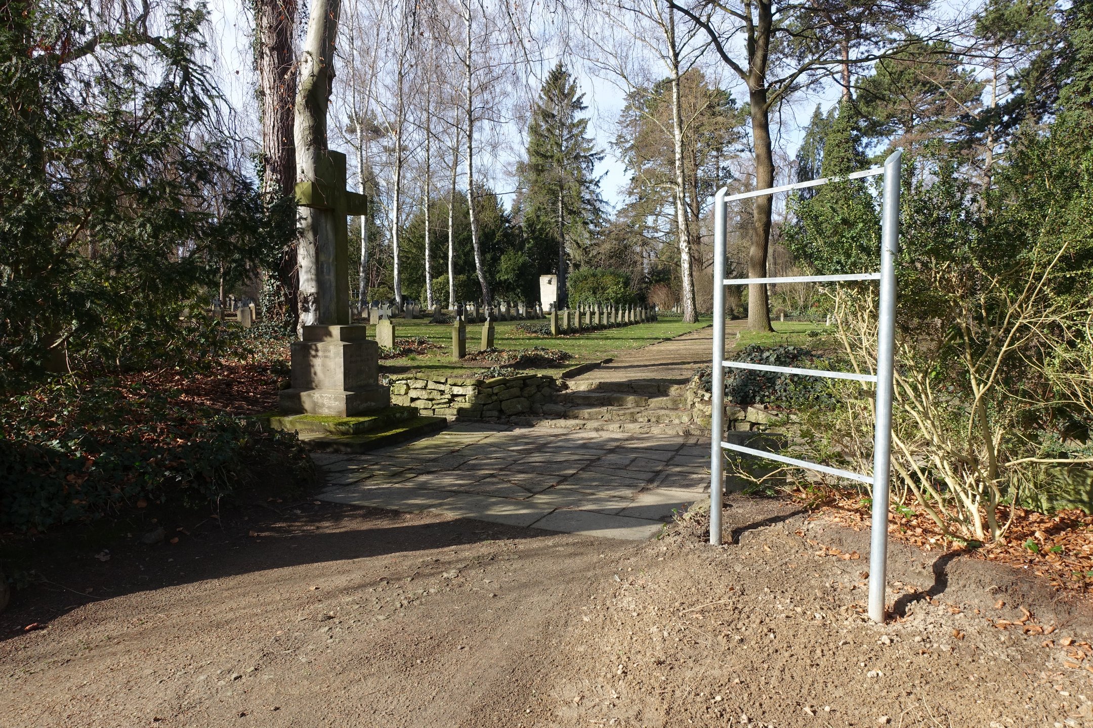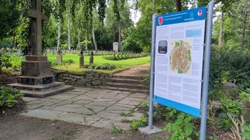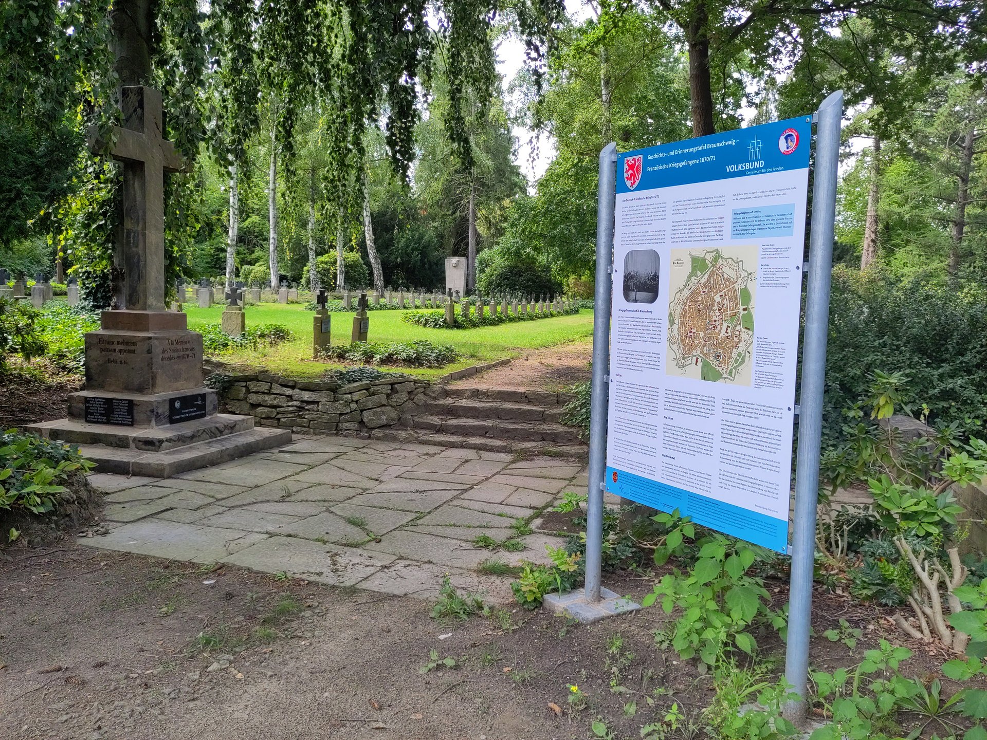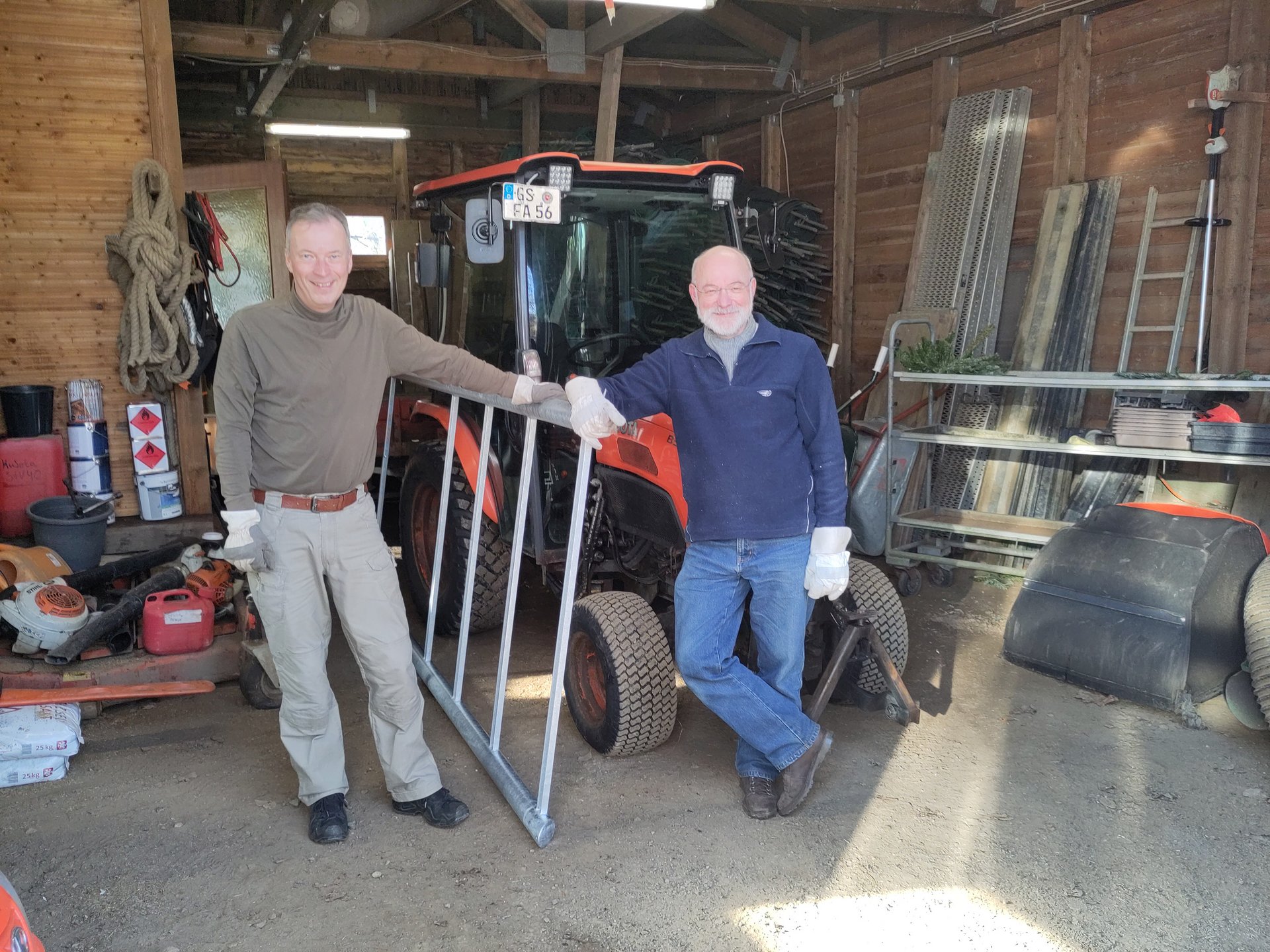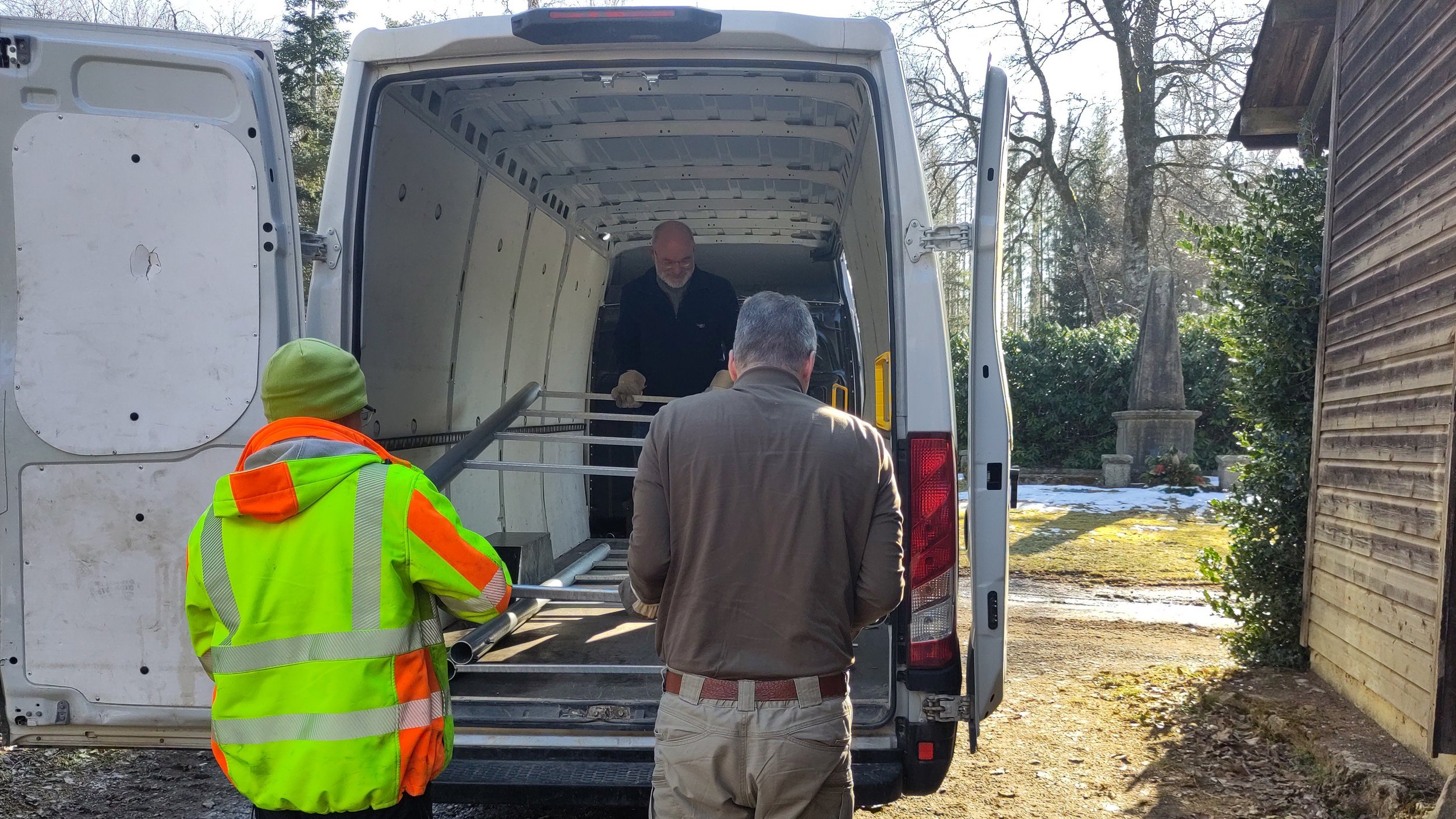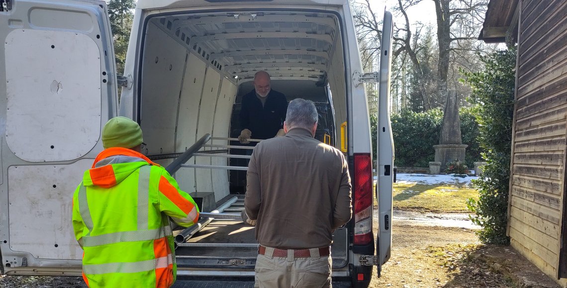 Darum transportieren Geschäftsführer Michael Gandt und Bildungsreferent Dr. Rainer Bendick regelmäßig im Frühjahr die Gestelle zu den Friedhöfen, deren Kriegsgräber im laufenden Jahr von der Bildungsarbeit erschlossen werden. In diesem Frühjahr waren es 13 Gestelle und eine Pulttafel für Projekte in Helmstedt, Watenstedt, Steinlah, Einbeck, Münchehof, Clausthal-Zellerfeld, St. Andreasberg, Braunlage, Hohegeiß und Harlingerode.