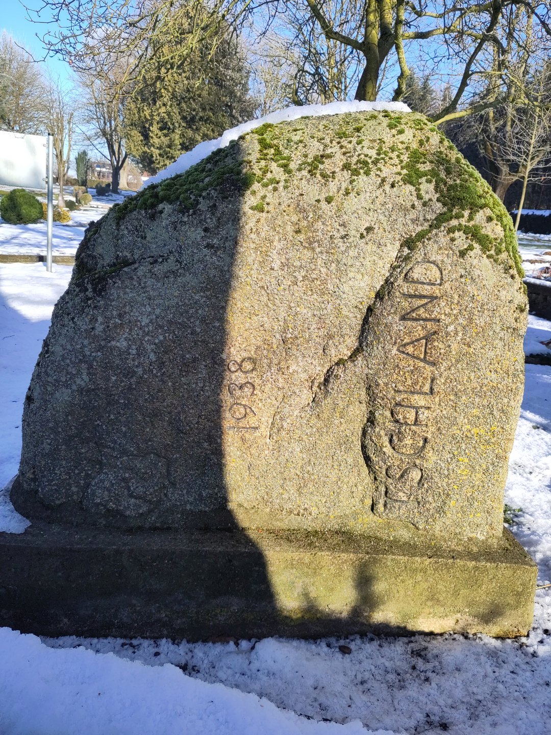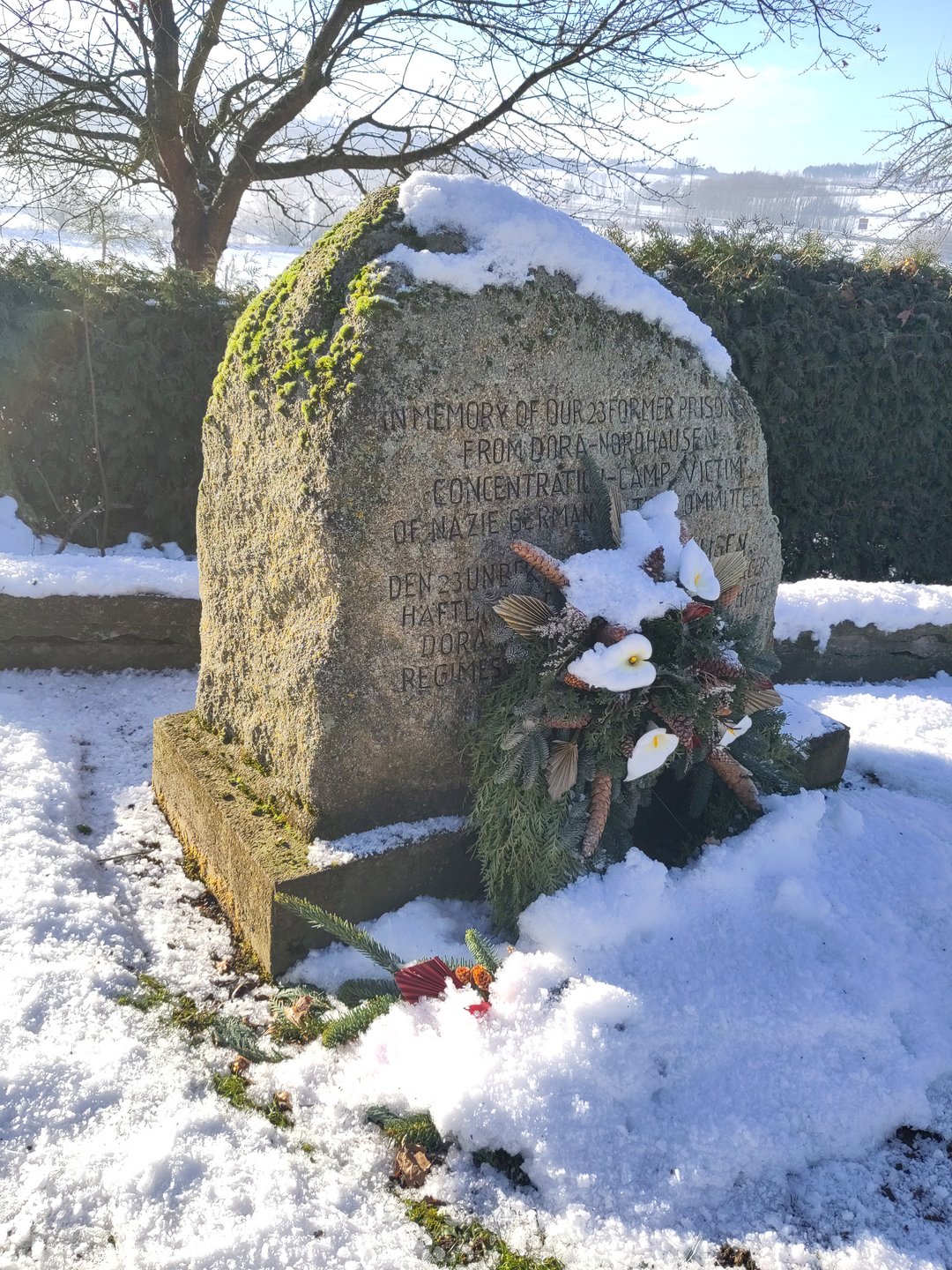 Da die Gleise durch Luftangriffe zerstört waren, konnte der Zug nicht weiterfahren. Einige Gefangene waren während der Fahrt verstorben andere gerieten bei den Kämpfen in Münchehof zwischen die Fronten oder starben nach der Befreiung an Durchfallkrankheiten, insgesamt 23 Menschen. Sie wurden in einem Massengrab beerdigt. Die Überlebenden wollten den Toten ein würdiges Grab schaffen. Der von den Amerikanern in Seesen eingesetzte Bürgermeister Arno Krosse (SPD) brachte den Gedenkstein ins Spiel, den die Nationalsozialisten 1938 anlässlich des „Anschlusses“ Österreichs in der Stadt aufgestellt hatten. Der Stein mit der Inschrift „GROSSDEUTSCHLAND 1938“ und einer entsprechenden Landkarte wurde so geteilt, dass nur noch „TSCHLAND 1938“ lesbar war – „als Symbol für den zerschlagenen Nazismus“, wie Joseph Soski, einer der ehemaligen Gefangenen, später schrieb. Am 16. September 1945 wurde der Grabstein feierlich eingeweiht. Er war eines der ersten Gedenkzeichen für KZ-Opfer in Deutschland.