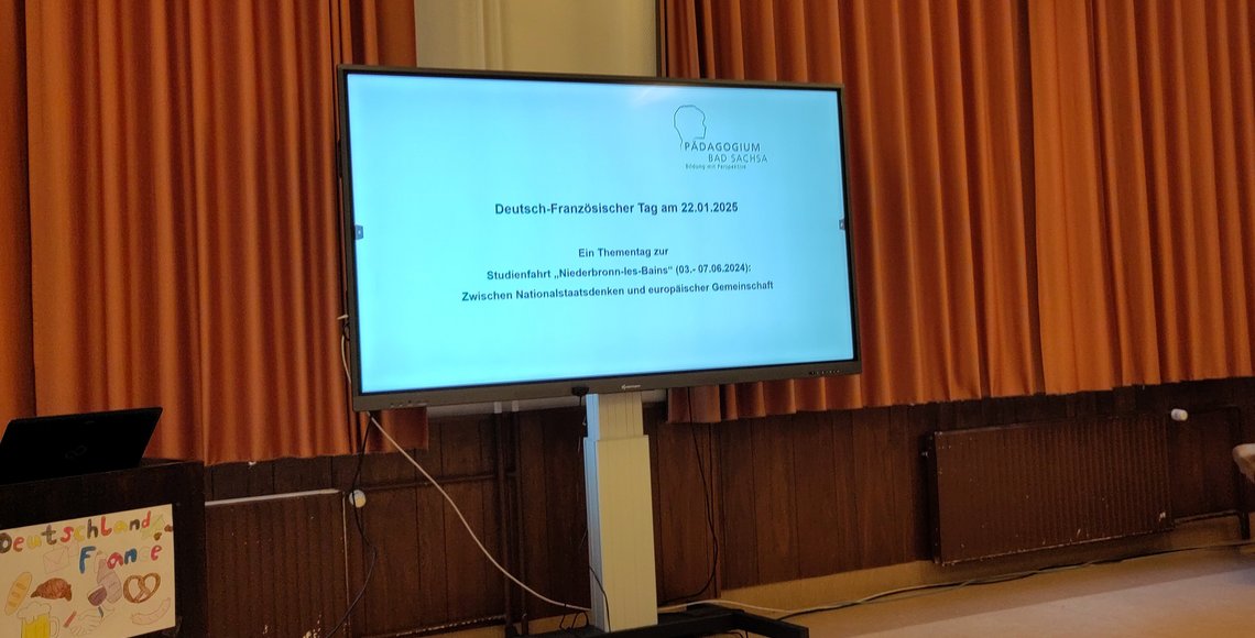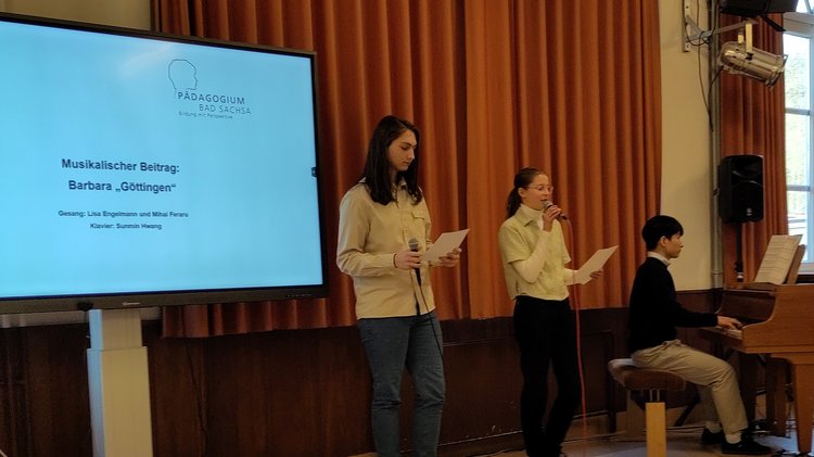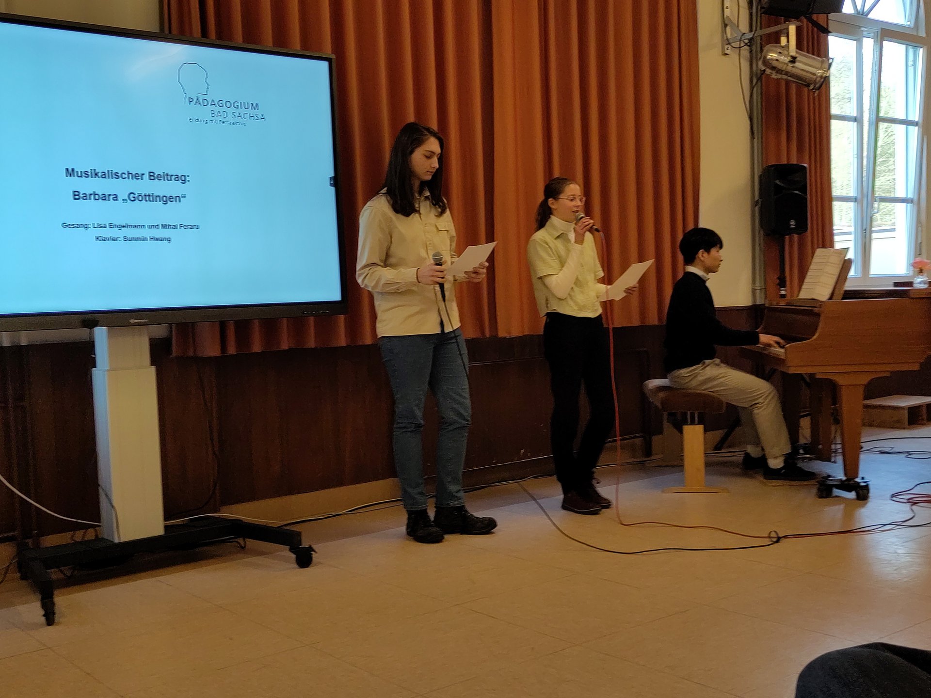 Schülerinnen und Schüler des Pädagogikums in Bad Sachsa begingen den Deutsch-Französischen Tag, indem sie in einer gut besuchten öffentlichen Veranstaltung über ihre Fahrten in die Jugendbegegnungsstätte des Volksbundes nach Niederbronn-les-Bains berichteten. In einem musikalischen Rahmenprogramm präsentierten die Schülerinnen und Schüler auch das klassische französische Chanson zu den deutsch-französischen Beziehungen „Göttingen“ von Barbara.