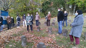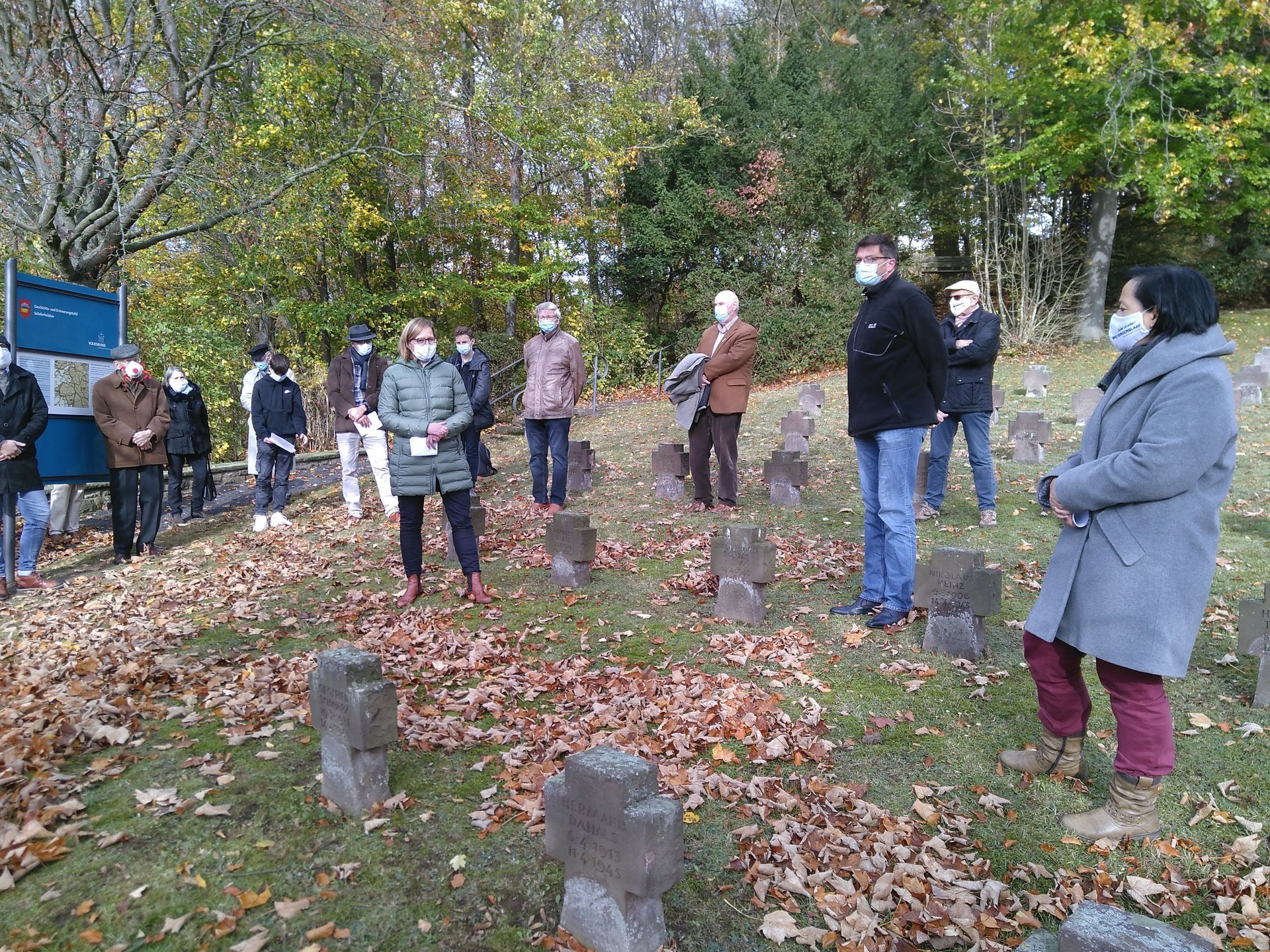Landrätin Astrid Klinkert Kittel danke dem Engagement der Löns-Realschule. In den Mittelpunkt ihrer Ausführungen stelle sie den Satz, den man oft auf Kriegsgräberstätten liest: „Den Lebenden zur Mahnung“. Die Geschichts- und Erinnerungstafel präsentiere gekonnt die besondere Situation in der Region. Im Frühjahr 1945 gab es hier 8 KZ-Außenlager: „Wohl keiner der hier beerdigten Soldaten starb in dem Bewusstsein, durch sein militärisches Handeln das Leiden in den Konzentrationslagern zu verlängern. Aber wir, die Nachgeborenen, wir kennen die Zusammenhänge: Der militärische Widerstand der deutschen Armee brachte nicht nur den jungen deutschen Soldaten den Tod, er verzögerte auch die Befreiung der Lager und verhinderte das Überleben vieler Gefangener.“