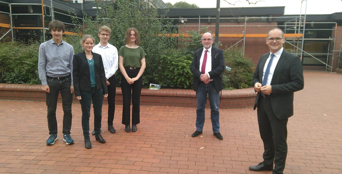 Mit Jonte Salzbrunn, Jan Länger, Caja Führmann und Camilla Kopplow, Schülerinnen und Schüler des Gymnasiums Neue Oberschule in Braunschweig, waren genau die richtigen Ansprechpartner anwesend. Ihre Klasse, die 10ex, hat im vergangenen Schuljahr nicht nur bei der Haus- und Straßensammlung mitgemacht, sondern auch eine Geschichts- und Erinnerungstafel für das Gräberfeld 69b auf dem Braunschweiger Hauptfriedhof erarbeitet. Durch das Engagement der Schülerinnen und Schüler ist ein bis dahin unbeachtetes Massengrab von Zivil- und Zwangsarbeiterinnen und Zwangsarbeitern sowie Kriegsgefangenen aus der Zeit des Zweiten Weltkriegs auf dem Braunschweiger Haupt Friedhof dem Vergessen entrissen worden. Diese Arbeitet hatten sie zudem in einem Beitrag zum Volkstrauertag 2019 vorgestellt. Grund genug, dass Minister Tonne ihr Engagement während des Landesvertretertags würdigte.