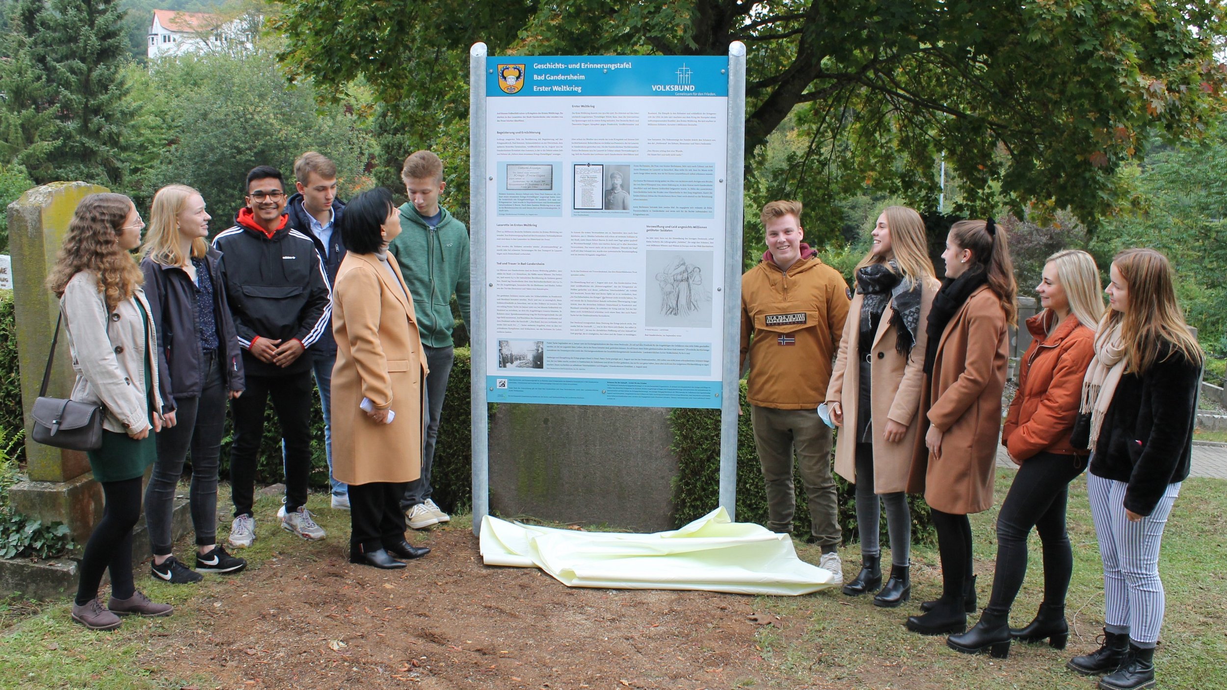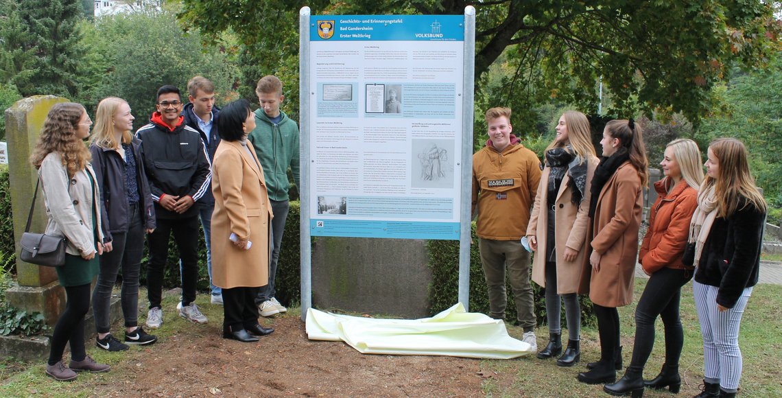 Schülerinnen und Schüler des Roswitha-Gymnasiums haben eine Geschichts- und Erinnerungstafel für das Gräberfeld Erster Weltkrieg auf dem St.-Georgs-Friedhof erarbeitet. Sie wurde gestern, am 30. September, eingeweiht. Aus diesem Anlass sprachen vor etwa 50 Gästen Landrätin Astrid Klinkert-Kittel als Kreisvorsitzendes des Volksbundes, Bürgermeisterin Franziska Schwarz, Volksbund-Bezirksvorsitzender Walter Johannes Herrmann und der Schulleiter des Roswitha-Gymnasiums Kilian Müller. Er betonte die Bedeutung von Projektarbeit. Sie eröffne den Schülerinnen und Schülern Erfahrungs- und Handlungsräume, die über die Möglichkeiten des normalen Unterrichts weit hinausgehe.